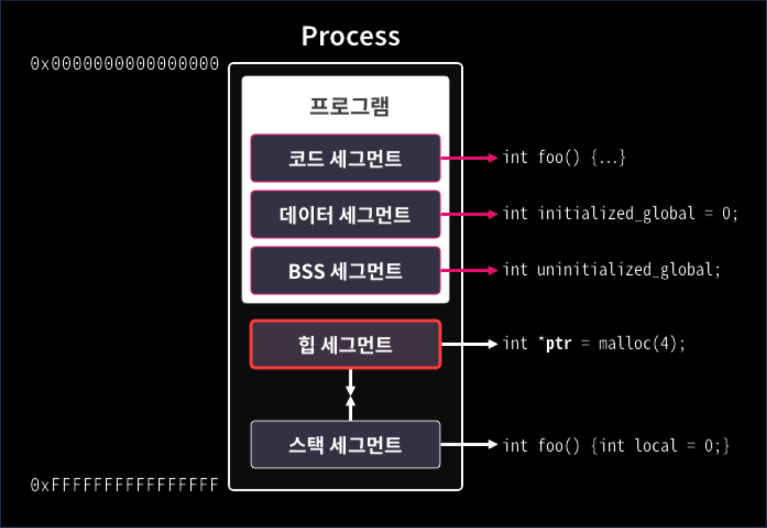 heap segment: 힙 데이터가 위치하는 세그먼트
