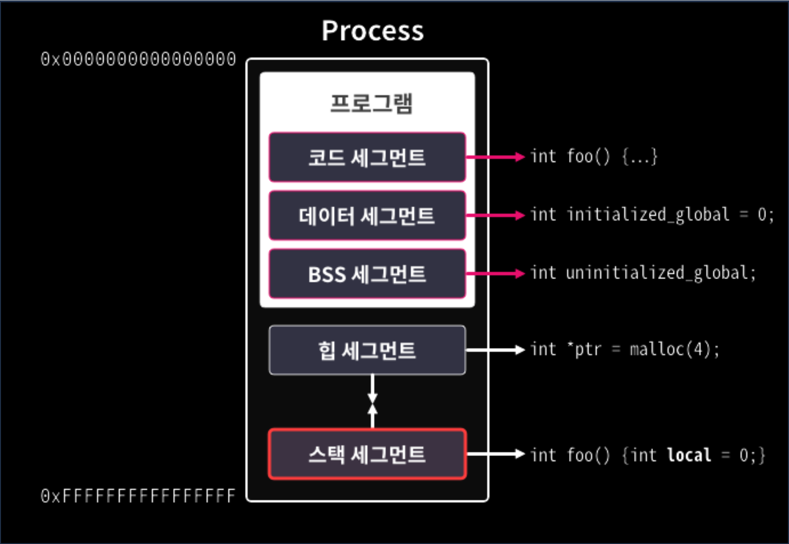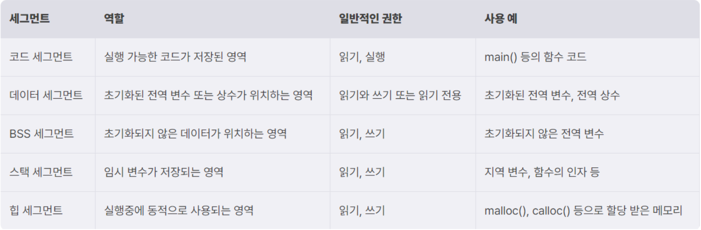 ↳ (1)코드 세그먼트, (2)데이터 세그먼트, (3)BSS 세그먼트, (4)힙 세그먼트, (5)스택 세그먼트