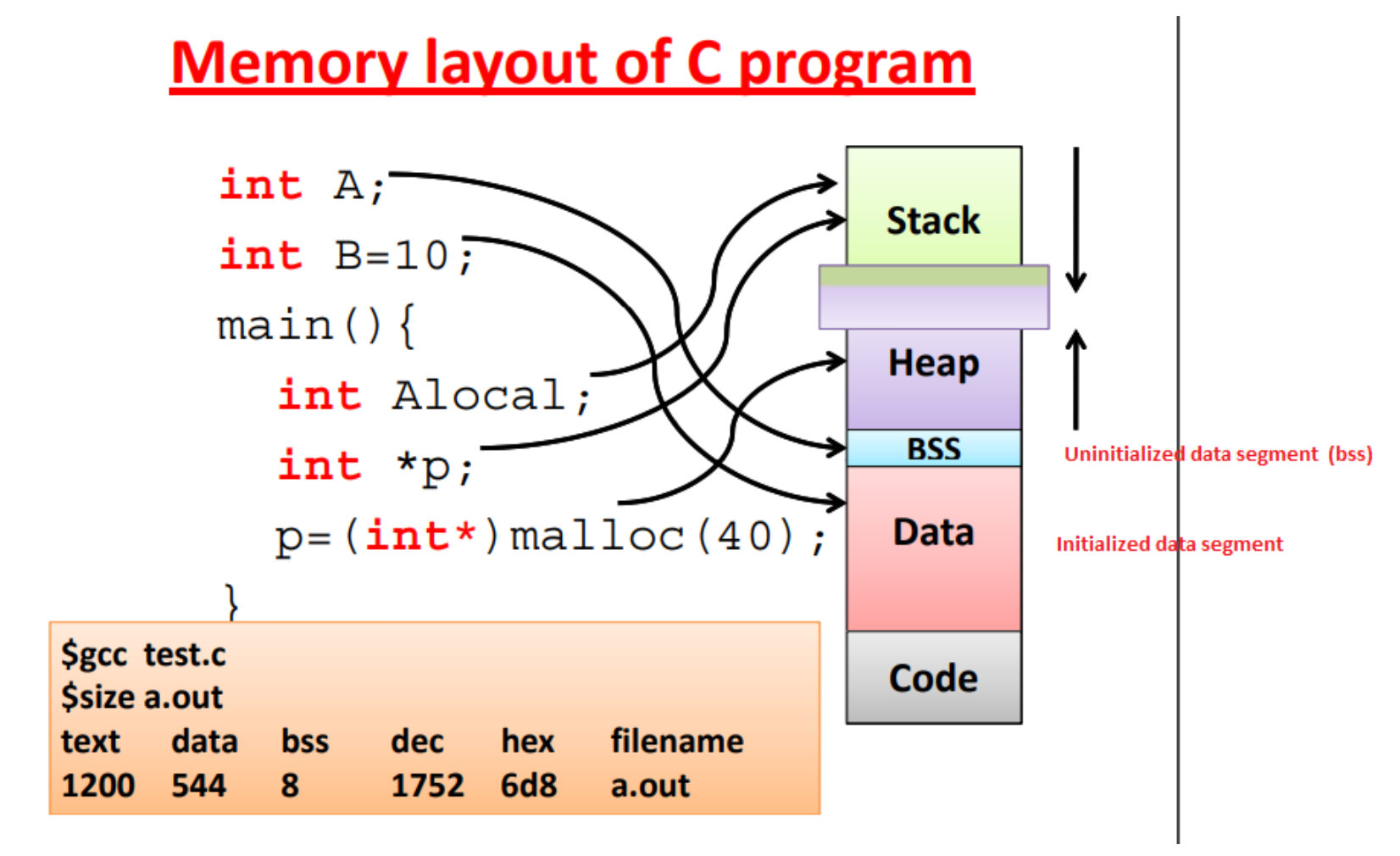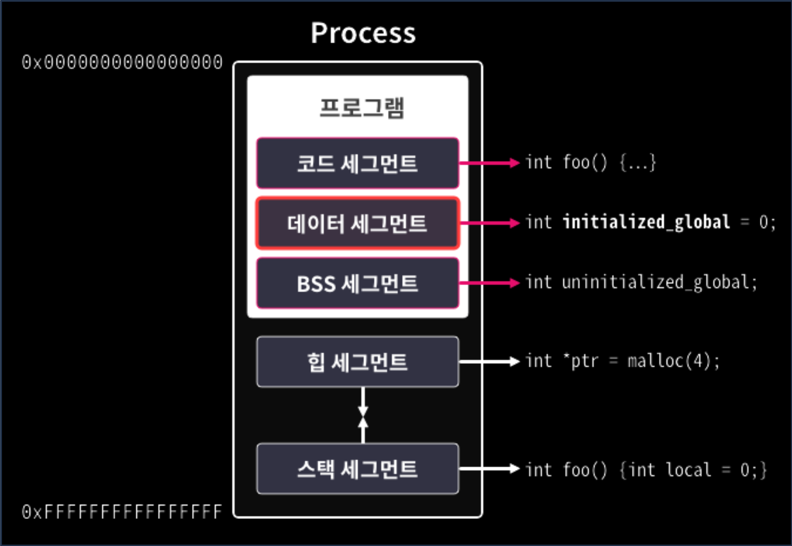 BSS segment: 프로그램이 실행될 때, 값이 모두 0으로 초기화 되는 영역 (Block Started by Symbol Segment)