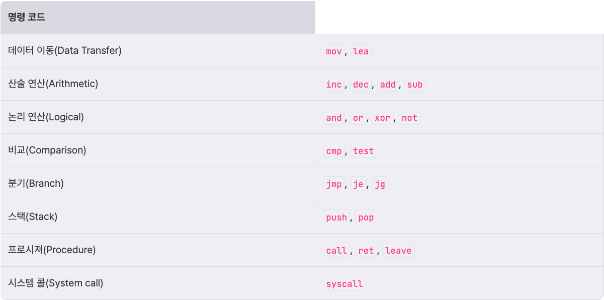 어셈블리어 = 명령어(Opcode, operation code) + 피연산자(Operand)